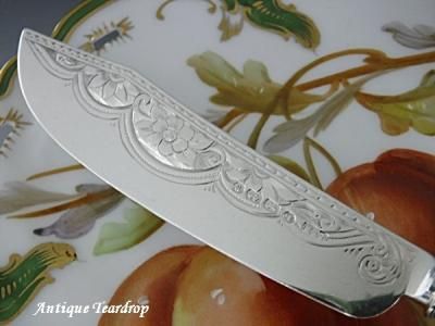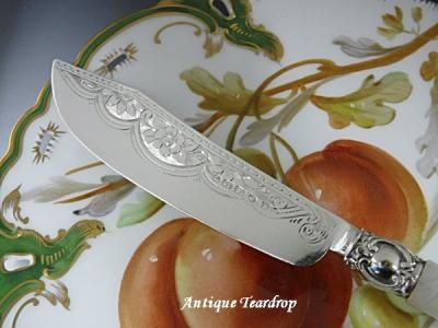 ナイフ部分には、可憐な花の彫り込み装飾が施されています。