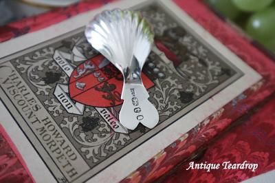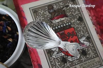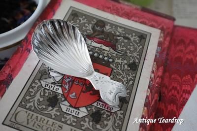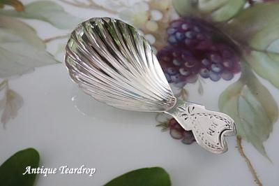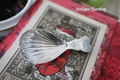 シェル型デザインのティーキャディスプーンですが、柄の部分の先が二つに割れており魚の形のようにも見えるデザインです。